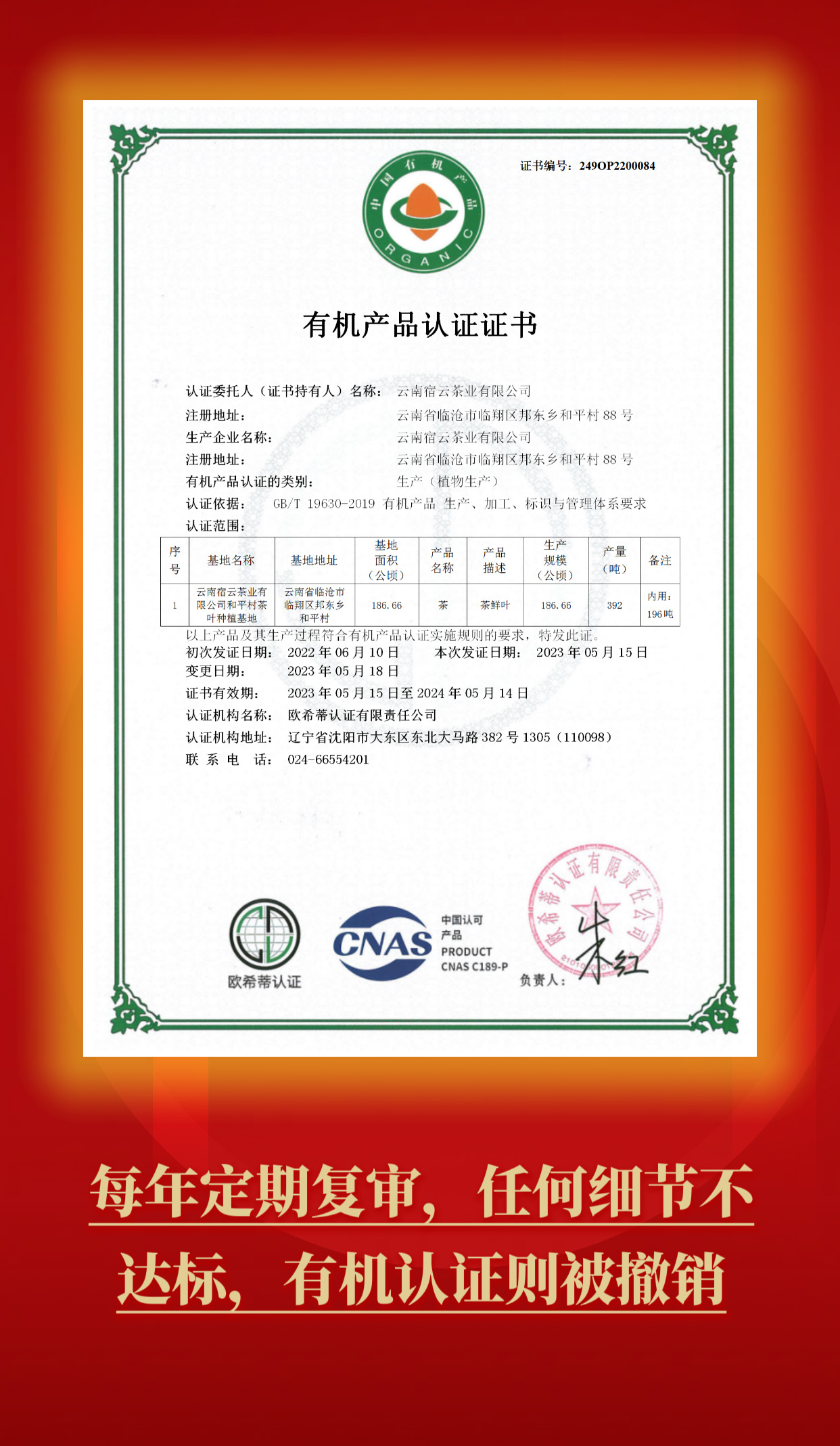 宿云古樹茶再獲權(quán)威認(rèn)證——中國有機(jī)產(chǎn)品認(rèn)證證書!